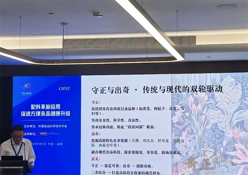 近日,由中國食品科學(xué)技術(shù)學(xué)會(huì )(CIFST)主辦的第二十五屆中國方便食品大會(huì )在四川成都召開(kāi)。本屆大會(huì )以“韌性成長(cháng) 向新而行”為主題,通過(guò)權威報告、行業(yè)對話(huà)、創(chuàng )新展示等不同維度,全面解碼方便食品產(chǎn)業(yè)高質(zhì)量發(fā)展的新趨勢、新動(dòng)能與新路徑。奇正青稞作為青稞產(chǎn)業(yè)龍頭企業(yè),攜旗下產(chǎn)品參會(huì ),奇正集團總經(jīng)理、奇正青稞董事長(cháng)程若瓊做了題為《 守正出奇--以新質(zhì)生產(chǎn)力開(kāi)拓高原的藥食寶藏 》為主題的專(zhuān)題報告。